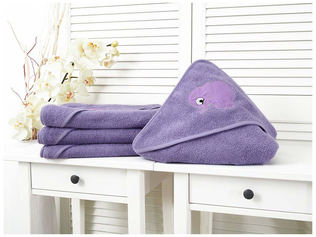 Dětská froté osuška fialová se slonem o rozměrech 90x100. Osuška má praktickou šitou kapuci pro zabalení dětí po koupeli. Dětská osuška je vyrobena ze 100% bavlny o gramáži 400g/m2.