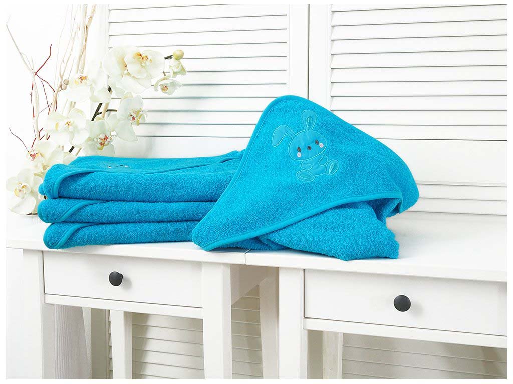 Dětská froté osuška tyrkysová se zajícem o rozměrech 90x100. Osuška má praktickou šitou kapuci pro zabalení dětí po koupeli. Dětská osuška je vyrobena ze 100% bavlny o gramáži 400g/m2.